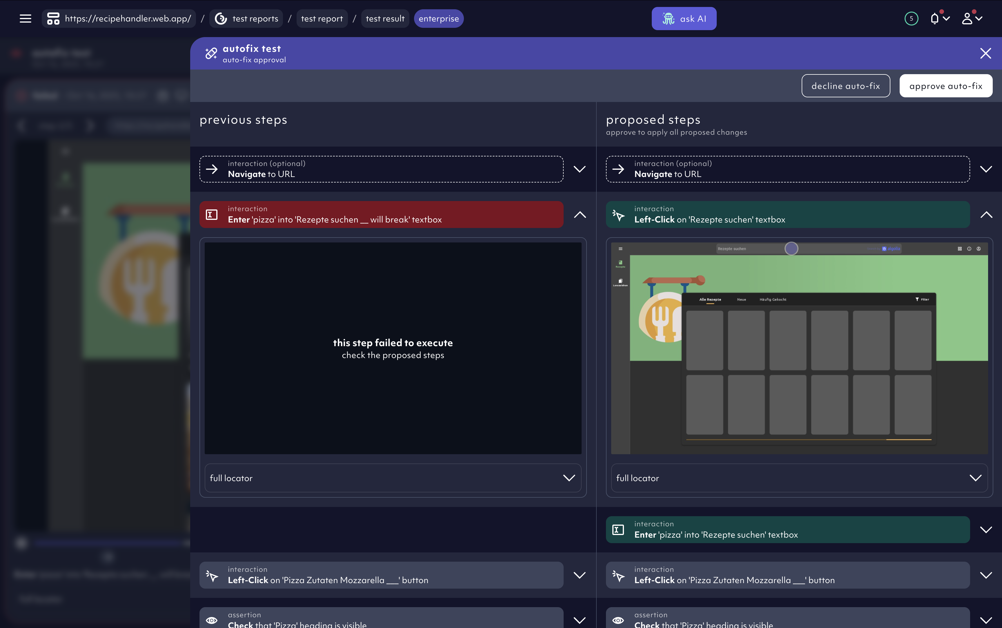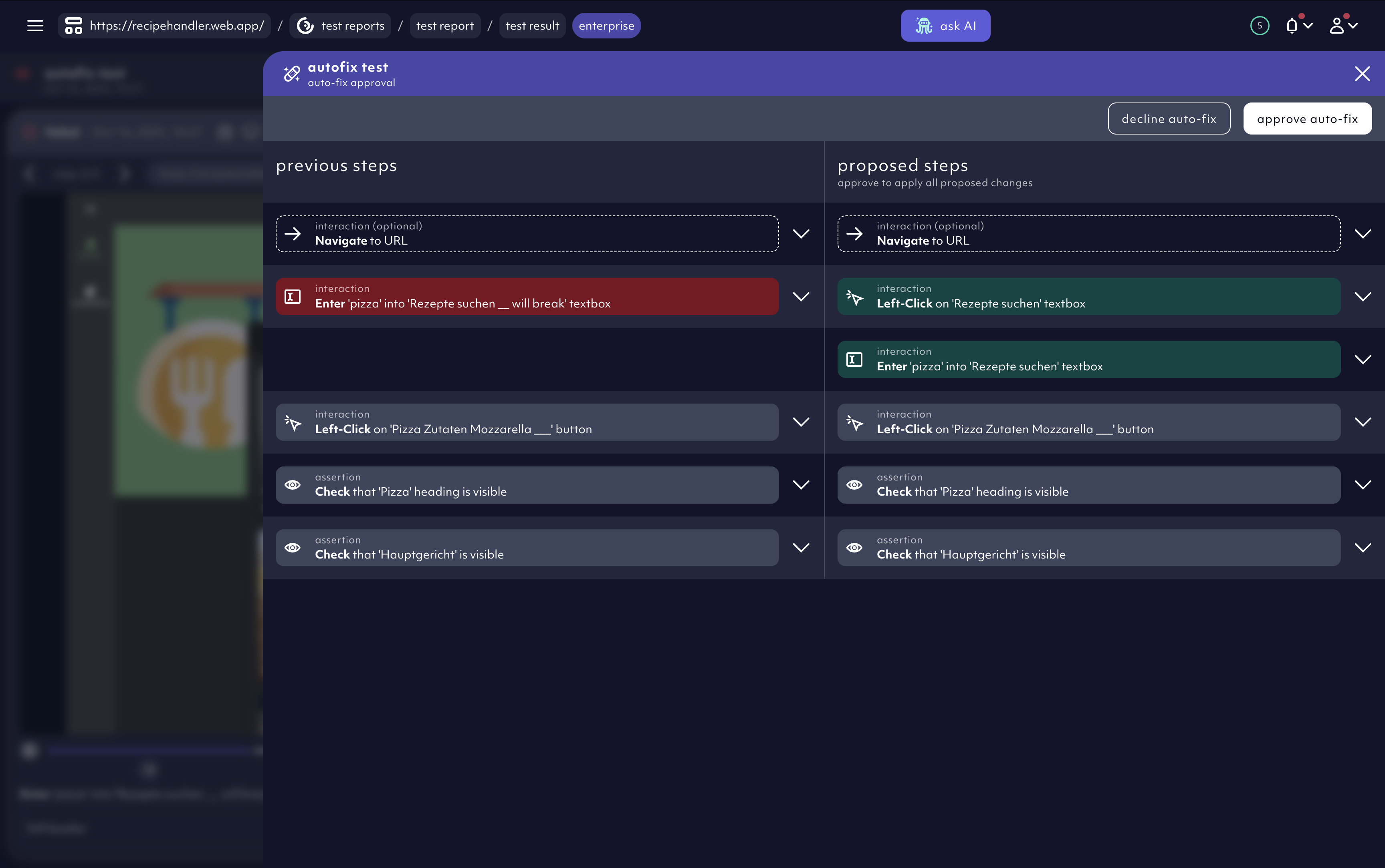 - Click ‘approve auto-fix’ to apply the AI’s changes and automatically update the test.