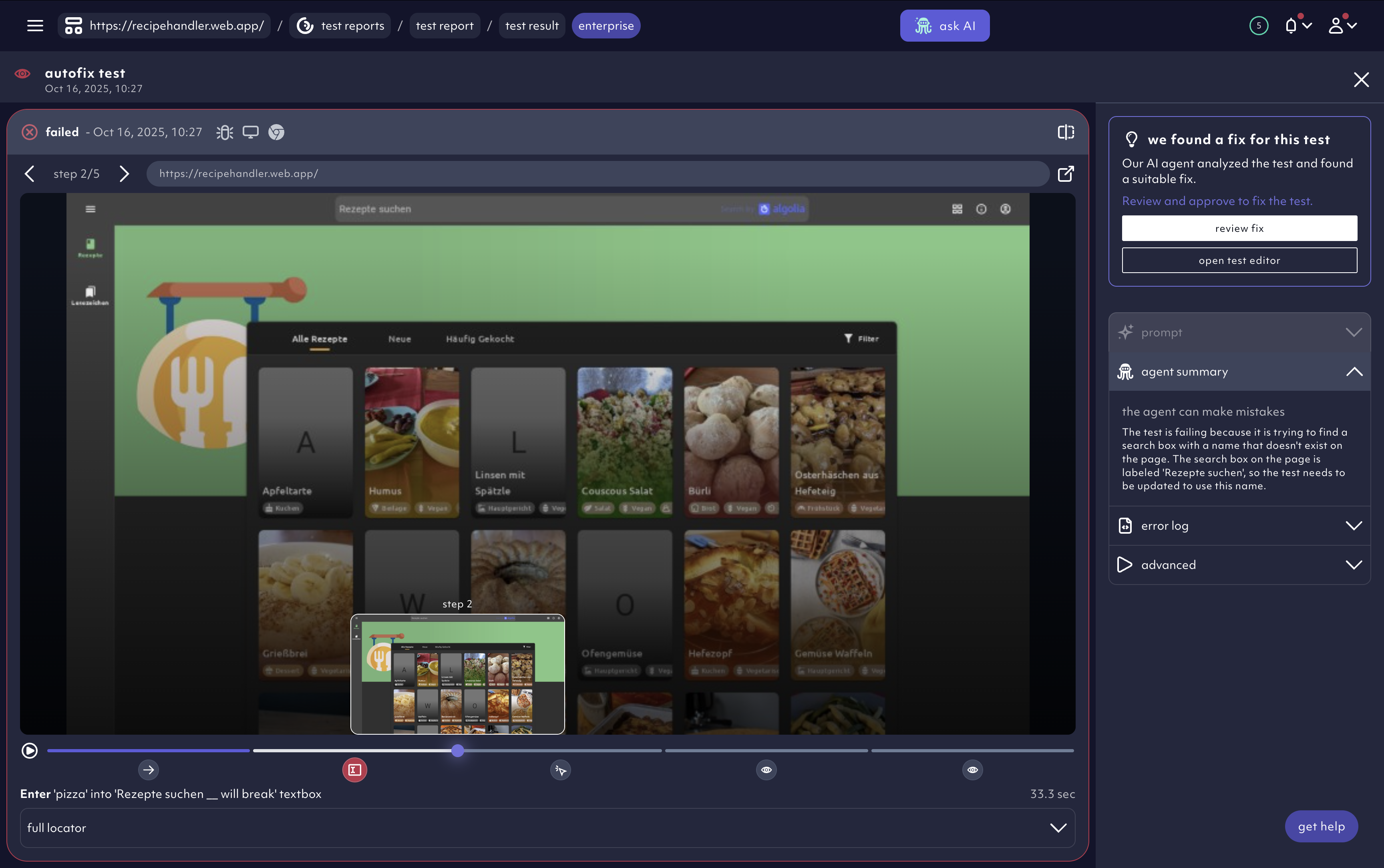 When a test fails, the AI agent analyzes:- Changes in the application’s UI (e.g., updated element locators or structure)